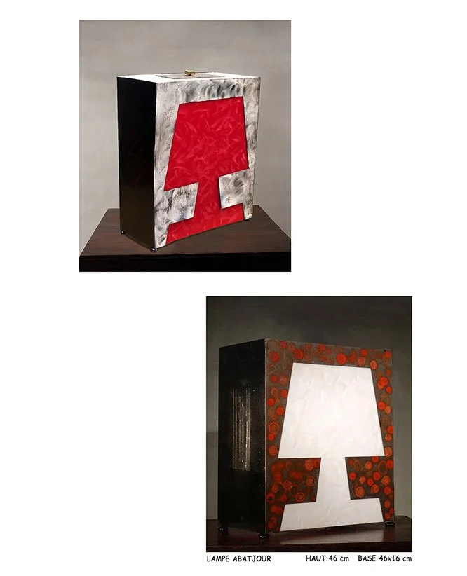 Made of metal, plexiglass and wood, these surrealist designs include printed images of bulbs or lamps on plexiglass, inserted into handmade structures.